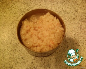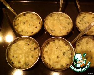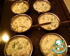 Смешать в миске мясо криля (1 баночка- 200 гр), пожаренный лук, порезанные яйца, 3 стол.ложки свежезамороженного горошка (можно и без него), нарезанную зелень, 2 стол.ложки майонеза. Тщательно перемешать. Разложить по кокотницам (у меня вышло 6 штук).
