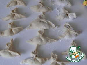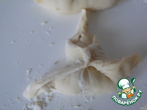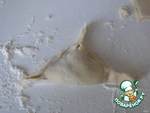 На присыпаной мукой рабочей поверхности,раскатать тесто в тонкий пласт и разрезать на квадраты.Выложить на них начинку.