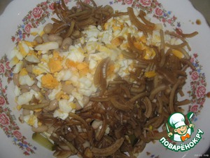 • Добавить нарезанные яйца и лук (отжать его от уксуса).