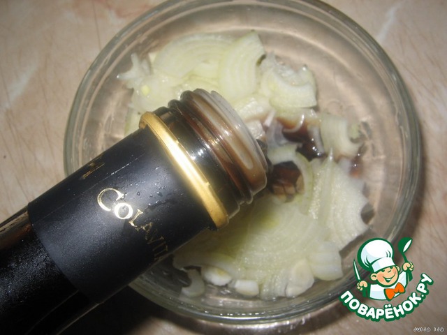 • Лук нарезать соломкой, промыть и, залив бальзамическим уксусом, оставить мариноваться.