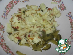 • Тем временем, нарезать яблоко и солёный огурец, соломкой.