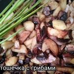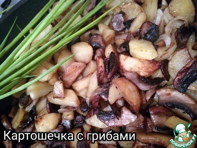 Грибы (можно брать любые) обжарить на растительном масле с луком и чесноком,посолить,поперчить,на другой сковороде обжарить тонко нарезаное сало,(по желанию можно еще добавить лук обжариваться),добавить почищеную и порезаную картошку, добавить грибы, и обжарить до готовности,посолить,поперчить,добавить порезаную зелень. Приятного аппетита!