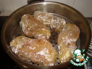 Посолим. Перчим, Заворачиваем в пищевую пленку и выкладываем на решетку пароварки. Варим на пару 10-15 минут Зависит от толщины кусков