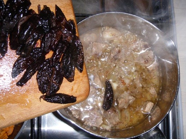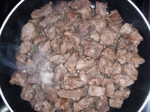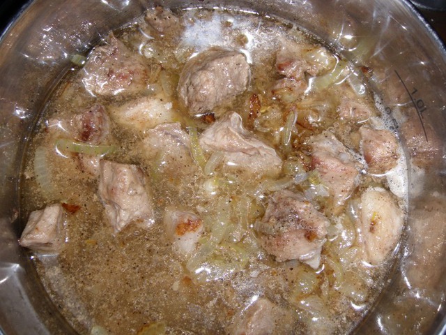 • Когда мясо подрумянится вместе с луком, выкладываем его в неглубокую ёмкость, солим/перчим (я ещё немного сахарю) и добавляем кипяченой воды приблизительно 3/4 от общего объёма. Доводим до кипения и тушим под крышкой почти до готовности.