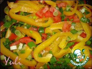 Вымыть и почистить овощи.Нарезать помидоры кубиками,стручки сладкого перца-полосками.