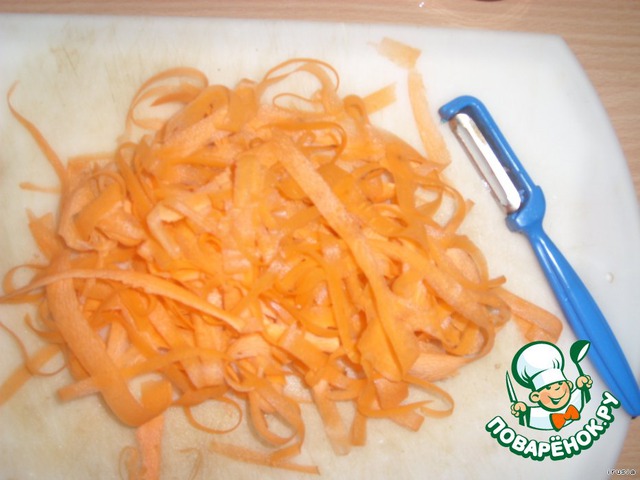 ... далее трём морковь на тёрке или режем соломкой кому как нравится - у меня настругана чистилкой для овощей.