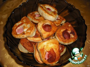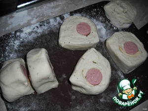 Сделать из пюре по размеру сосиски круг, положить кусочки твердого сыра потом сосиску и завернуть вернее слепить!