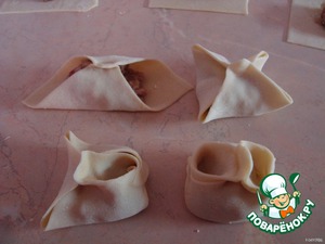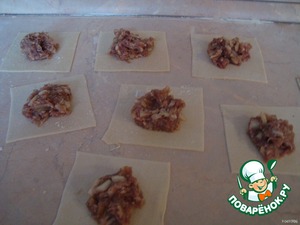 Тесто раскатать, нарезать квадратиками, и на каждый квадратик положить фарш.