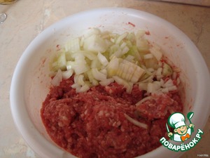 Нарезать кубиками репчатый лук (лука не жалейте, чем его больше, тем сочнее -манты) и добавить в мясной фарш. Идеально мясо резать мелкими кусочками, но я перемолола. Добавить соль, перец черный, чеснок (мелко резанный), зеру.