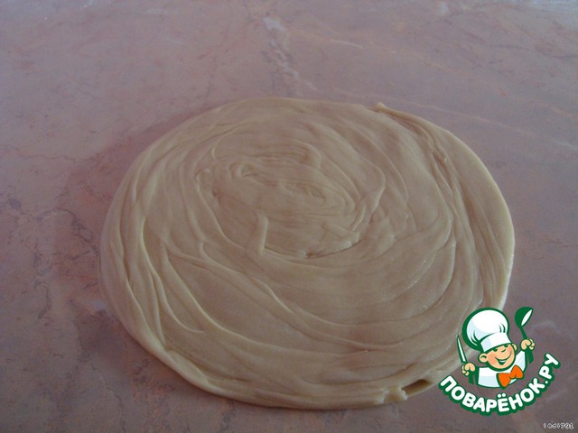 Свернутое в трубочку тесто, перевернуть и раскатать по диаметру сковороды.