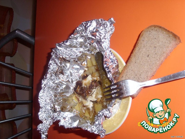 От себя хочу добавить 1 нюанс: фольгу надо положить в маленькую мисочку или салатник, тогда будет намного удобней выкладывать картошку с мяской и заворачивать. И ещё 1 плюс - все порции будут одинаковой формы и размера!
