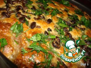 Наверх укладываем мясной фарш и грибы. У меня замороженные опята. Можно обойтись и без грибов или, наоборот, сделать только грибную запеканку без фарша.