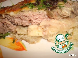 Правда я лук пережарила вместе с грибами и что бы картошка побыстрей приготовилась(поставила её в микроволновку на 10 мин,картошки я положила побольше шт.8).....А затем всё в духовку!!!