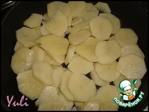Форму смазать растительным маслом, порезать сырую картошку тоненькими кружочками, посолить.