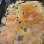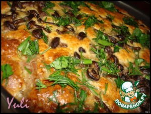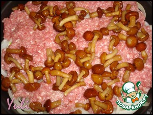 Наверх укладываем мясной фарш и грибы. У меня замороженные опята. Можно обойтись и без грибов или, наоборот, сделать только грибную запеканку без фарша.