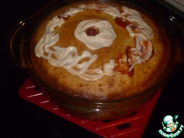 Приготовить тесто из муки, кефира, яиц и соды. Залить все тестом, поставить в духовку примерно на 40 мин. при температуре 200с.