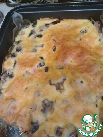 Правда я лук пережарила вместе с грибами и что бы картошка побыстрей приготовилась(поставила её в микроволновку на 10 мин,картошки я положила побольше шт.8).....А затем всё в духовку!!!