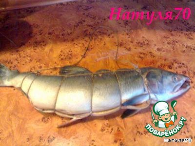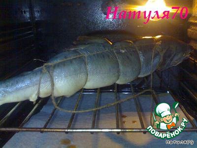 Отправляем рыбку в духовку на 3 часа. Температура должна быть ниже средней - нам нужно, чтобы рыбка коптилась, а не запекалась. За это время 3-4 раза мажем дымком.