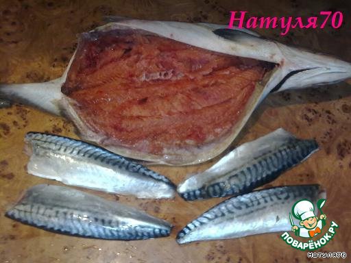 Горбушку отделяем от костей, скумбрию разделываем на филе