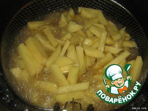 Картофель очистить, нарезать соломкой (крупной), обжарить на растительном масле (я - во фритюрнице).