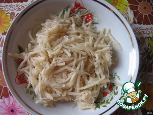 Трем картофель на терке для корей ской моркови (так из картофеля воды меньше вытекает)