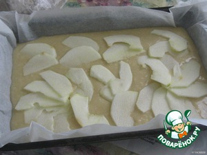 Тесто вылить в форму и сверху выложить яблоко произвольным рисунком