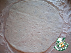 Сначала пальцами разминаем, а потом раскатываем в тонкую лепешку скалкой