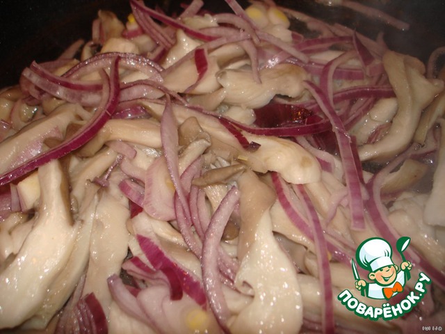 Лук нарезать полукольцами, добавить к грибам и обжарить до золотистости лука. -