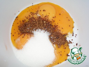 желтки взбить с сахаром, ванилином, корицей, орехами -