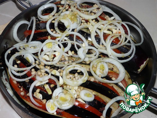 Посыпать травами, посолить,посыпать орехами, затем половину чеснока и лука. Все сбрызнуть оливковым маслом, закрыть форму фольгой и отправить в духовку на час-полтора. Готовность проверяем протыкая основание баклажана (там, где не до конца разрезали) - должно стать оч. мягким. Вкусно необыкновенно! Подавать можно горячим или теплым (еще вкуснее, мне кажется). Приятного аппетита!