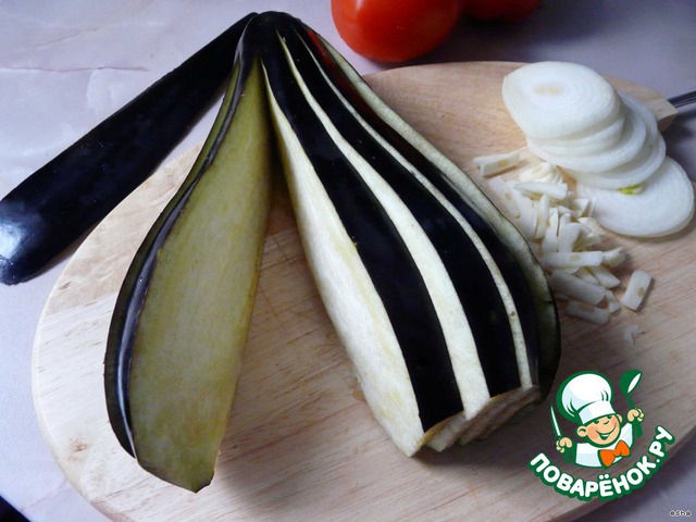Можно сделать веера так: баклажаны разрезать пополам, положить разрезами вниз на доску и разрезать на ломтики толщиной чуть меньше 1 см не доходя до конца. Или как здесь из целого. Срезать кожицу с одной стороны и целый баклажан разрезать на ломтики.