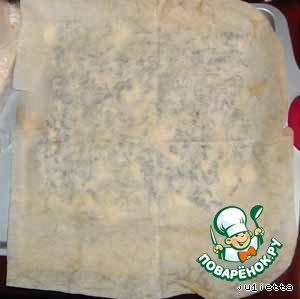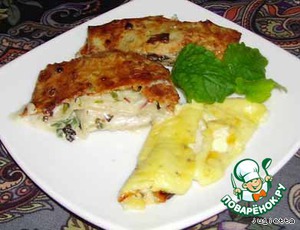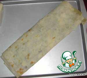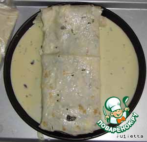 Уложить рулет на смазанную маслом форму подходящей величины (края рулета я подогнула). В таком виде можно уже обжарить рулет на плите с двух сторон, а можно пойти несколько дальше: залить омлетной массой и запечь в духовом шкафу (я запекала в конвекционной печи).