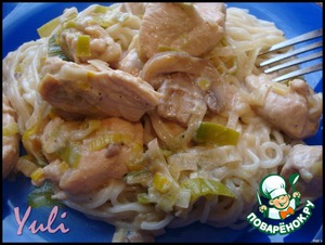 Очень нежные, чуть острые кусочки курицы с шампиньонами, горчицей, пореем и сливками - это изумительно просто и вкусно! Готовила эту курочку два дня подряд - понравилась нам безумно!