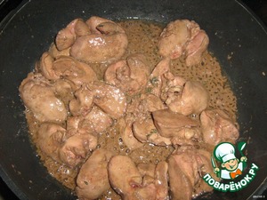 Даем постоять. От получаса и больше. Чтобы ароматы соусов и вина впитались в нашу печеночку.