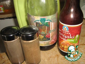Сначала подготавливаем печень. Хорошенько промываем, солим по вкусу и смешиваем с соусами: терияки и чили, добавляем вино и кусбару.