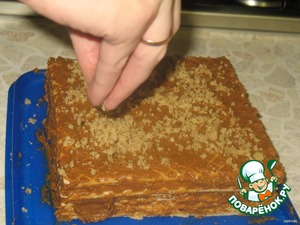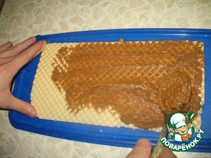 Вафельный корж уложить на блюдо, покрыть смесью из вареной сгущенки и орехов.