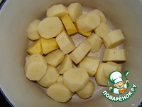 Очищенный картофель режем на половинки или на три части и выкладываем в посуду для смешивания.