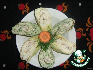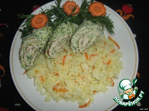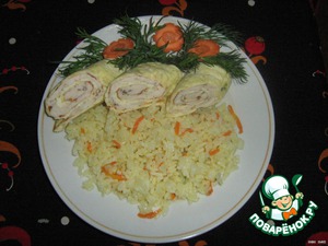 Готовые рулетики нарезаем на искосок , гарнируем пловным рисомhttps://www.povarenok.ru/recipes/show/23238/.Приятного Вам аппетита .