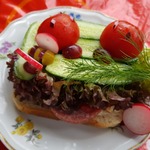 Ну а далее начинаем украшать наш бутерброд. Божьи коровки - из помидорок черри, пчёлки - из маслин, оливок и редиса, ромашка - из перепелиного яйца.