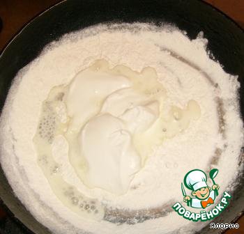 На раскаленной сухой сковороде подсушиваем и слегка подрумяниваем муку, добавляем сметану и энергично взбиваем кипящую смесь до однородности. Кладем в соус соль и измельченный чеснок с мелко нарезанным укропом. Разбавляем соус небольшим количеством крутого кипятка - до желаемой густоты.