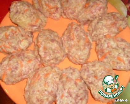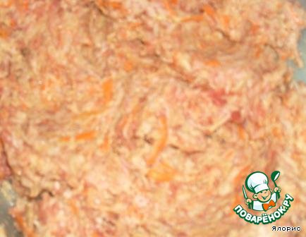 В фарш добавляем тертую крупную морковь, манку, тертую луковицу, тертый или измельченный в чесночнице чеснок, сметану, соль по вкусу. Вымешиваем фарш и "отбиваем" его рукой до полной эластичности. Фарш должен "отдохнуть" в холоде минут 7.