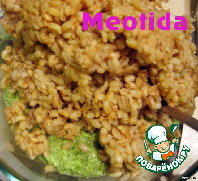 теперь соединяем нашу зелененькую смесь с перловой кашей