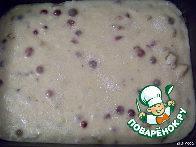 Выкладываем тесто в смазанную маслом форму, посыпаем сверху столовой ложкой сахарного песка.
