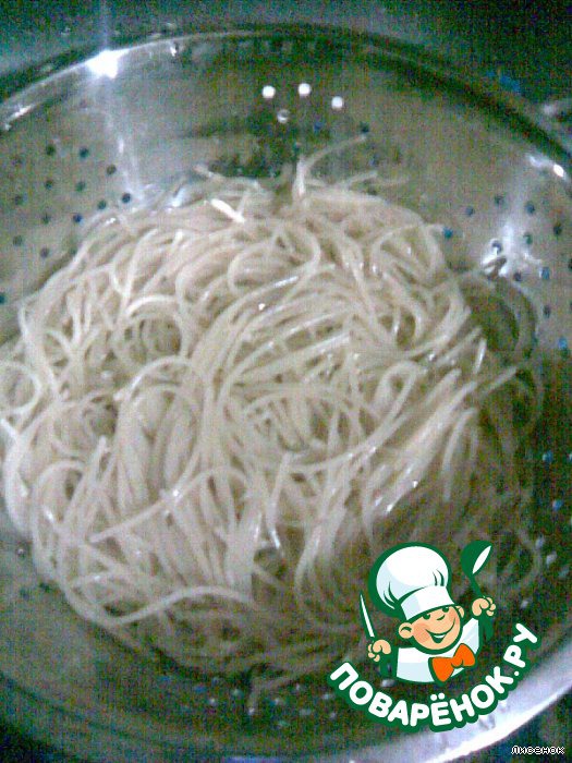 Спагетти поломать пополам и приварить в подсоленной воде. Они не должны быть готовы, но и не совсем сырые. Откинуть на дуршлаг и промыть холодной водой.