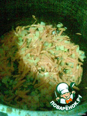 измельченный лук и натертую морковь на крупной терке обжариваем (я это делала прямо в казанке, где потом тушила и "паучков"). Когда овощи готовы, положить тамат и долить воды-пусть малость потушаться. -