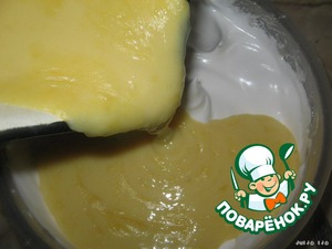 Соединяем белки с желтками. Перемешиваем, на самых низких оборотах миксера, а лучше просто лопаткой или ложкой.