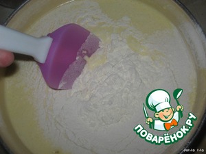 Лопаткой или ложкой, аккуратно, снизу вверх, в одном направлении, вмешиваем муку.