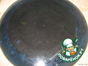 Собираем торт. Форму, выстилаем пищевой плёнкой, так, чтобы кончики свисали. Кладём первый, самый маленький корж.