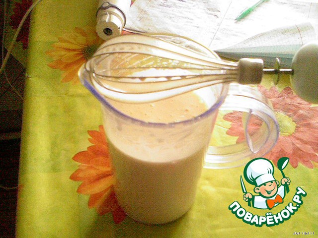 Посуда нам понадобится по-выше и по-больше для того, чтобы взбить тесто на бисквит. Яйца (и желтки и белки) и сахар для бисквита взбиваем минут 7-8 блендером (миксером будет вдвое больше)до образования густой пены. Потом аккуратно по ложке всыпаем муку, не переставая взбивать.