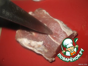 В куске мяса сделать тонким длинным ножом надрезы (так, как если бы Вы мясо шпиговали).